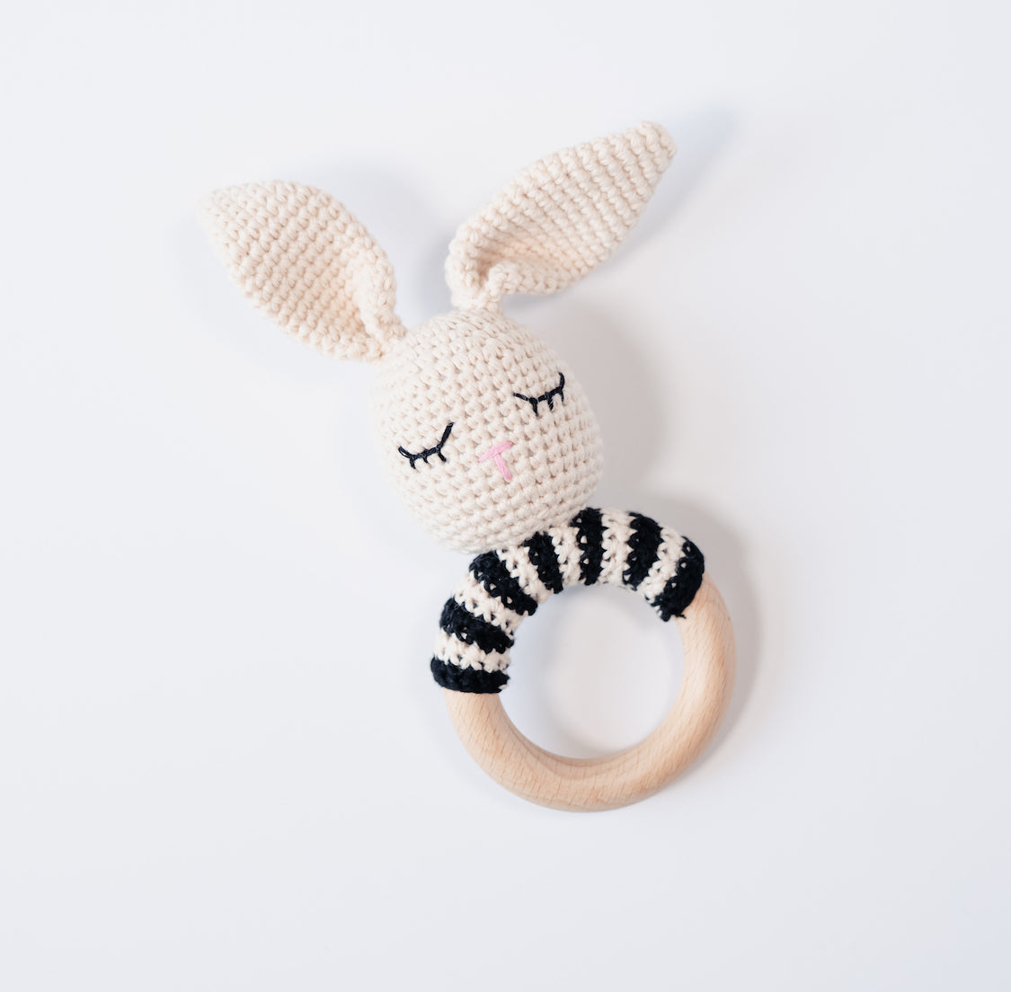 Our handcrafted crochet bunny rattles make for a beautiful baby gift and keepsake. Made of 100% cotton and a beech wood ring teether, they help develop baby's early motor skills.